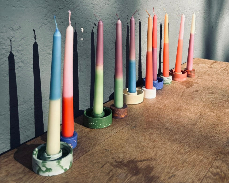 Mach mit bei einem kreativen und unterhaltsamen Workshop, in dem du zwei besondere Kerzenhalter aus Raysin im Terrazzo- und Marmor-Look gestaltest und passend dazu zwei Kerzen färbst.