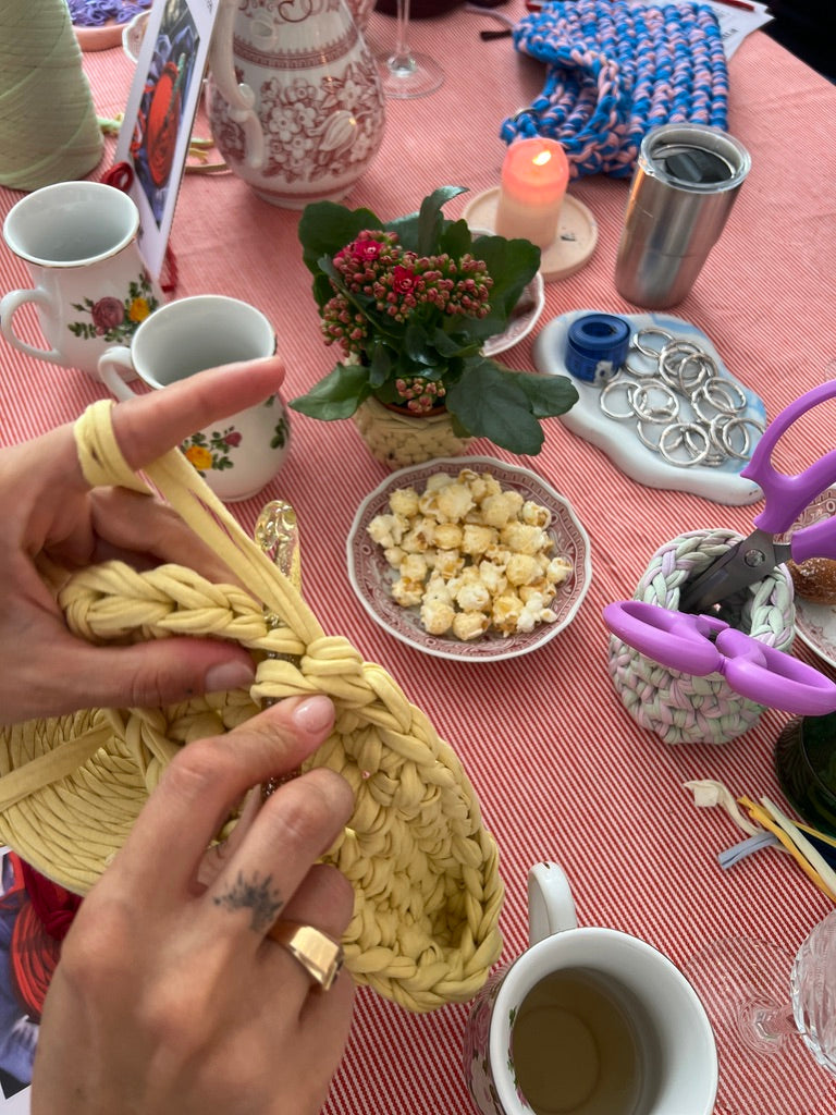 In gemütlicher Runde, mit Musik, leckeren Getränken, kleinen Snacks und hochwertigem Recycling-Jersey-Garn in vielen Farben kannst du direkt loslegen.